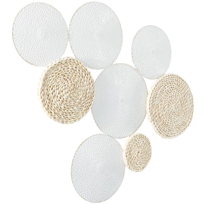 - White metal and rope wall accent features round shapes with textured spiral and twisted weaving patterns