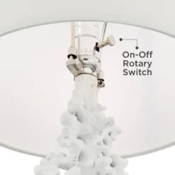 Add style to living rooms or seating areas with this set of tropical coastal table lamps by 360 Lighting. Each lamp features a white finish column of faux coral crafted from cast resin. The coral stands on a real white marble pedestal at the very bottom. Up top are white linen drum shades that add a wonderful finishing touch.