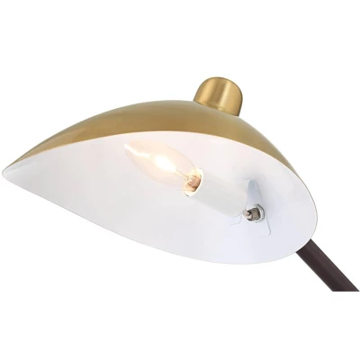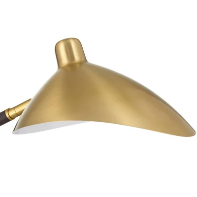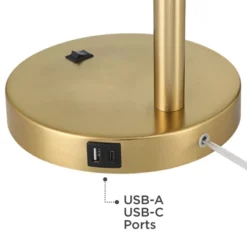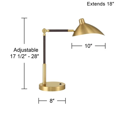 Traditional design meets a retro Mid-Century modern aesthetic with this functional desk lamp in warm brass with elegant leather trim. The shade features a downward-facing asymmetrical shape and can be adjusted in multiple directions for focused lighting. Handy USB ports allow you to charge smartphones and other electronic devices whether or not the light is turned on.