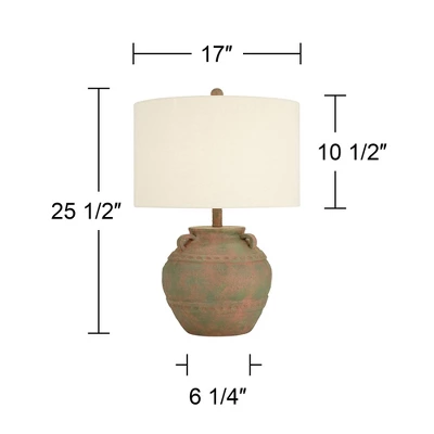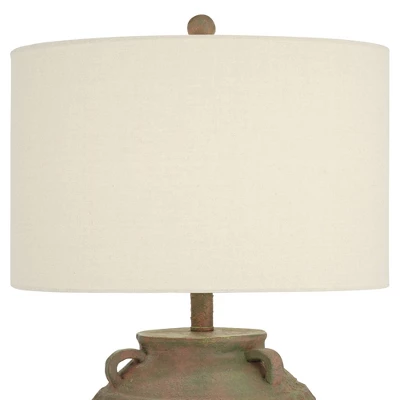Brighten your home with this handsome lamp design from the 360 Lighting brand. The design features a rustic jar-profile base that comes in a decorative, distressed musk green finish. The jar detailing is a wonderful look for both rustic lodge and traditional room decor. Up top is a white fabric drum shade.