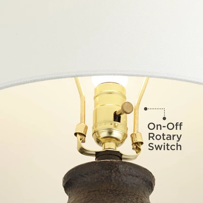 - Rustic black finish lamp base. Cast resin construction. Round black finish metal at the very bottom.