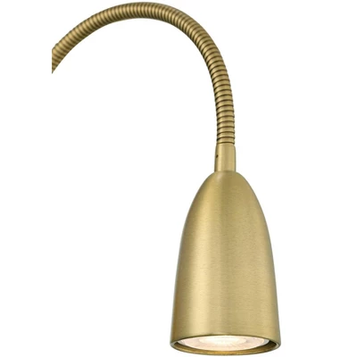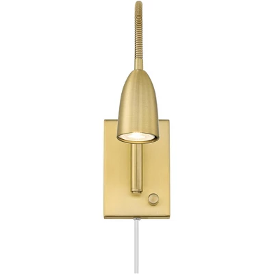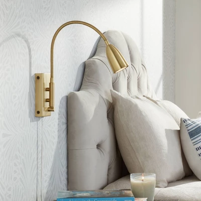 Easy to install, this plug-in wall lamp is perfect for task lighting and reading. Just attach to the wall and then plug into a wall outlet, there’s no electrician needed. The streamlined modern profile is finished in warm gold and includes a full range dimmer. The adjustable gooseneck arm allows you to direct light where you need it most. Use bedside as a bed reading lamp, or install over a work or study desk for bright and adjustable lighting.