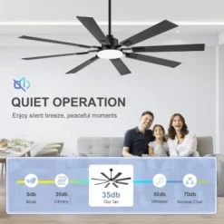 The Airsurfer 72″ Windmill Ceiling Fan features a sleek matte black design with matching blades for a modern, industrial look. Equipped with color-changing integrated LED lighting, this fan offers customizable lighting options. The 8-blade design ensures optimal air circulation, while the included remote control makes it easy to adjust fan speed and lighting. Ideal for large spaces, this fan brings both style and functionality.