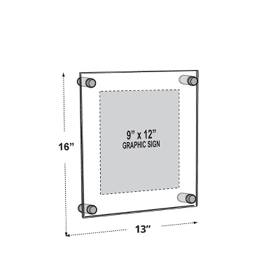 These classy one-sided Wall Mount Floating Frames are ideal for displaying artwork, photos, posters or branding in your office, home or at an event. These clear double panel floating frames with silver caps are strong, stable, as well as easy to clean and maintain. The innovative design holds your artwork or picture in place without it moving or slipping at all. Add elegance to your professional environment with Azar’s clear acrylic gallery frames with silver satin aluminum caps and standoffs. Frames can be used vertically or horizontally. Each floating sign holder frame set includes 2 acrylic panels that are 3/16 thick, 4 silver standoff caps and hanging hardware. Note: Large format sizes: 24 x 36 and 30 x 40 include 6 standoffs and caps. Easy to change the sign or photo, simply unscrew the front silver cap and switch out the graphic. There is no need to remove the frame from the wall once it is affixed. The edges are flame polished giving these floating picture holders a high end finish with a touch of fancy. Hang these beautiful acrylic frames in boutiques, museums, trade shows, hotel lobbies, restaurants, retail stores, schools, at work or at home. Sold in Multiples of 1. Sold in Multiples of: 1 Material: Acrylic (3/16 thick) Frame Orientation: Portrait/Landscape Poster Measurement: 9 x 12 Overall Frame Measurement: 13 x 16 Includes:Four 1 SILVER diameter aluminum standoffs and caps, and four all purpose screws with anchors. (Gold Cap Hardware can be purchased as an add-on item.) Color: Clear