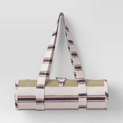 Soak up the sun in comfort and style with the help of this Beach Mat from Threshold™. Made from 100% seagrass for a natural look, this rectangular beach mat features printed accents to add a dash of style. Great for beach hangs, picnics at the park, outdoor cookouts, or adding a soft layer to your tent, this flat-pile beach mat is designed with a carry strap for easy bundling and transportation.