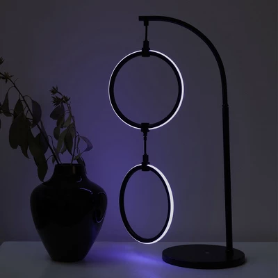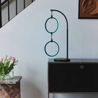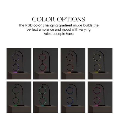 Introducing the Nova RGB Table Lamp by Brightech, the epitome of elegance and versatility. Tailored to complement various décors, from industrial and mid-century to modern and minimalist, its unique two-ring fixture and matte black finish elevate any room. Use it as a captivating centerpiece or for subtle ambient lighting. This modern table lamp is as functional as it is stylish, boasting 3 built-in color options. Dive into a kaleidoscope of hues with the RGB gradient mode or switch to a cool white for a classic touch, all at a button’s tap. Designed for safety and stability, its heavy base resists tipping, making it perfect for living rooms, bedrooms, offices, or even children’s rooms. The efficient 9-watt RGBCW LED lights promise longevity and savings on energy bills. And with Brightech’s 3-year warranty, you’re assured of quality and reliability. Experience the future of home lighting!