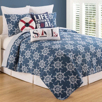 Accent your lake house decor or complement your nautical style with the Better on the Boat Pillow. This pillow features a classic nautical navy, red, and white printed and embroidered design with the too-true slogan of “Life is better on the boat.” Pair this beautifully detailed accent pillow with your coordinating lake house or nautical accents for a casual look. Finished with a coordinating piped edge and secured with a zipper closure. A cotton cover and a lofty polyester filling, this pillow adds the finishing touch to your maritime decor. Spot clean.