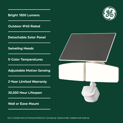 GE Outdoor Style Integrated LED Solar-Powered Security Fixtures illuminate outdoor spaces without wiring. Feature-packed and reliable, Outdoor Style fixtures brighten dark and shadowy spaces, no cords or wires required. Select the white tone to complement your home’s exterior and the settings to help enhance efficiency and security. Swivel the heads to direct the bright light where it is needed. Easy to install on walls or under eaves, Outdoor Style solar-powered fixtures include security and energy-saving features like dusk-to-dawn sensing, adjustable motion detection and moveable solar panels to help keep your home secure. All-weather construction and integrated LEDs help ensure you come home to the lights on. Backed by a 2-year limited warranty and a brand you can trust, Outdoor Style Security Fixtures keep darkness at bay.