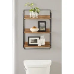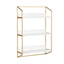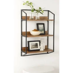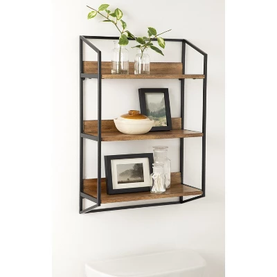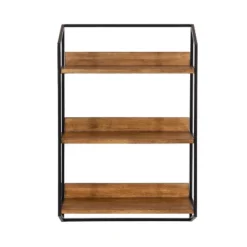 A wall shelf is no longer only for storage! Now your space-saving storage solutions can be a charming and show-stopping wall display. That’s what makes the Hylton wall shelf so perfect! It features three tiers of lovely and resilient wooden shelves within a sturdy metal frame, creating a jaw-dropping display and storage solution for all your favorite keepsakes and household necessities. Its beautiful mixed materials finish makes for a bold impression in any room of the home. The Hylton shelf is 18 inches wide by 6.5 inches deep with a height of 27.75 inches, making it the perfect addition to any living room, bedroom, bathroom, entryway, or dining room. Each shelf is 17.25 inches wide by 6 inches deep, with 8.5 inches of space separating each shelf for keepsakes, photos, bathroom necessities, plants, and other household necessities. Hang this beautiful mixed materials wall shelf in only a matter of seconds with the convenient metal eyelet hangers securely attached to the back of the metal frame.