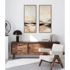 Experience the beauty of abstract landscapes with this serene artwork, featuring a peaceful vista rendered in subtle tones and gentle brushstrokes. Its minimalist design and modern aesthetic add a touch of sophistication to your decor, making it a versatile piece for complementing various interior styles. Framed in the USA in Waunakee, Wisconsin, this modern floating canvas art is sure to bring joy to your space. Our design team curates art that will fit perfectly in any room of your home. Showcase this art in your living room, bedroom, home office, kitchen, bathroom, nursery, or anywhere you want to bring a little beauty and charm to your walls. Specializing in home décor, we are continually bringing timeless works of art for the traditional decorator as well as trend-forward pieces for that eclectic art lover. Our high-quality framed canvas art also makes excellent gifts for birthdays, holidays, or housewarming parties. Printed on gallery-wrapped canvas and framed with a simple gallery frame this wall art is easy to display on the wall and will match with any décor style. The outer dimensions are 18 inches by 40 inches by 1.6 inches. Print Name: “Peaceful Landscape III”