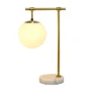 In a minimalist vintage-inspired style with modern leanings, this Kelly Wearstler metal desk lamp comes in a burnished brass finish for a rich, strong golden look. A lovely round milk white glass shade hangs down from the design. Includes an energy-efficient LED bulb for use. Perfect for home offices, study spaces, and more.