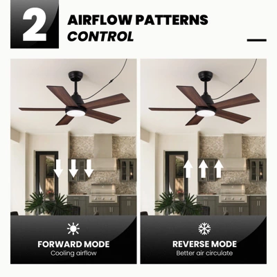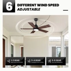 This 42-inch farmhouse-style waterproof ceiling fan features reversible double-sided five blades, making it suitable for indoor spaces and covered patios. It offers convenient control via remote or app, allowing you to adjust six fan speeds, reverse airflow, choose from three light color temperatures, and set timers—all with separate control for fan and light. Equipped with a dimmable 21W LED light in three color options and powered by a high-efficiency DC motor, it combines energy savings with performance. The fan includes 3.9″ and 7.9″ downrods and comes with 5 meters of waterproof wiring for reliable installation. Most setups are quick and easy, taking less than an hour with clear instructions.