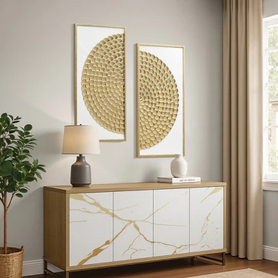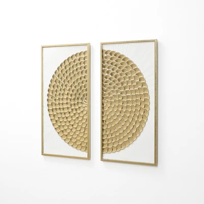 Bring modern rustic charm to your home with this 2-piece white and distressed gold metal wall art set. Each panel features a textured circular pattern in layered gold tones on a crisp white background, creating a stunning focal point. The distressed finish adds vintage character, while the sturdy iron construction ensures durability. Perfect for living room sofa walls, above bedroom headboards, in entryways, or staircases, this set adds depth and style to any space. Easy to hang and versatile in design, it’s the ideal accent for a sophisticated home.