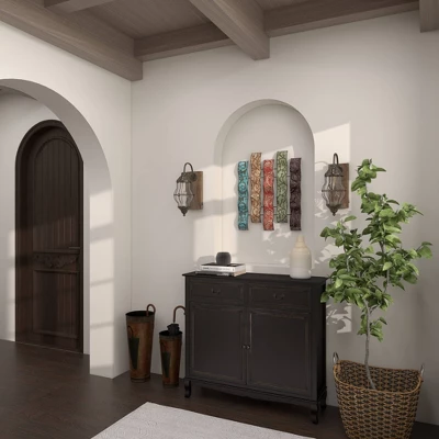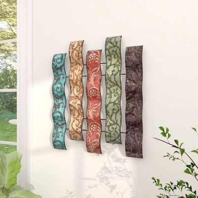 The colorful yet muted tones coupled with the embossed designs add loads of texture and pops of color, so display as a centerpiece to tie your space together. This item ships in 1 carton. Can be hung vertically using the keyholes on the back; nails and screws not included. Suitable for indoor use only. This item ships fully assembled in one piece. This is a single multi colored wall sculptures. Traditional style.