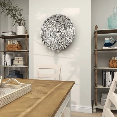- This wall decor features circular patterns of mussel shell pearls materials and circular wood base