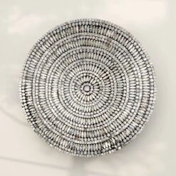 - It features a circular design with circular patterns from attached mother of pearl mussel shell materials