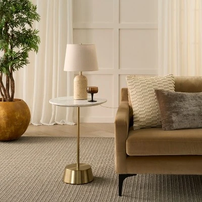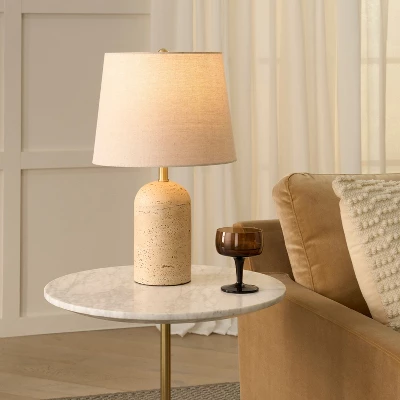 - Rounded travertine stone base with brass accents and a beige fabric shade for a warm, natural look