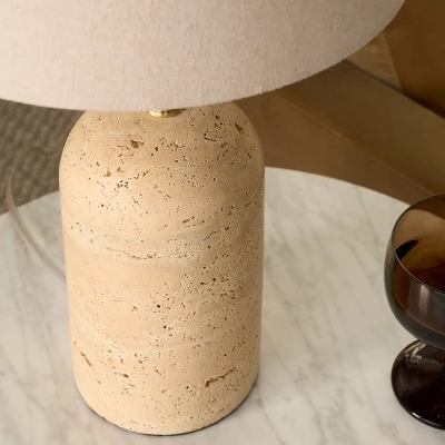 Elevate your decor with the natural beauty of this neutral table lamp. Featuring a timeless, small travertine stone base, this lamp brings earthy tones and organic textures into your decor. Each lamp is unique, with individual stone variations that add character and charm. The design is elevated with subtle brass accents, adding a touch of sophistication. Paired with a warm beige fabric shade, it creates a cozy, ambient glow, perfect for enhancing living rooms, bedrooms, or reading nooks.