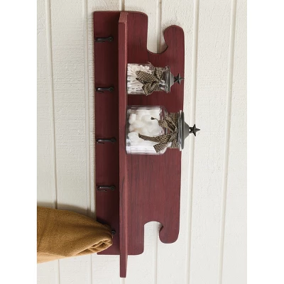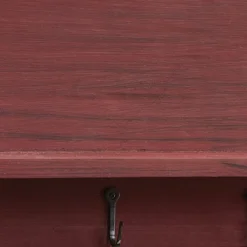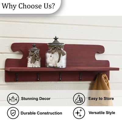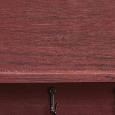 Create a stylish wall display by transforming any bare wall into a unique farmhouse display with this wooden wall mounted shelf. The barn red inspired finish adds rustic charm perfect to enhance any entryway, bathroom, or room wall decor. Easily mount on your wall to utilize the five metal hangers as a convenient organizer for household essentials and everyday items from keys to towels, purses, belts, and more. Not only can you use this item as a hanging display, but you can also use it as a floating shelf that can be used to stylishly accessorize your wall space with country charm. The included shelf design allows it to be used as a decorative display for picture frames or a functional storage accessory for countertop items.