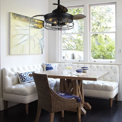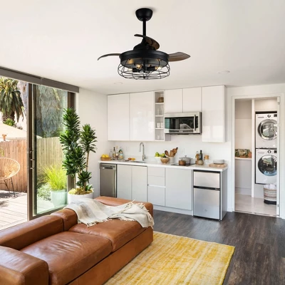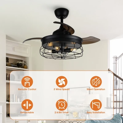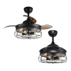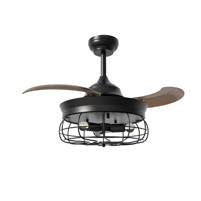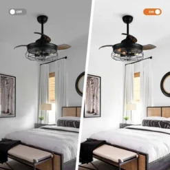 This modern black ceiling fan features retractable fan blades for a compact and aesthetically pleasing look. The metal skeleton shade is great for reproducing real light. You can use the included remote control to switch on and off the light and adjust the wind speed, which can meet the needs of daily life.