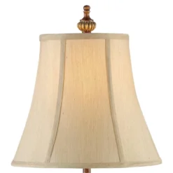 - Bell-shaped beige fabric lamp shades with ball finials. 5-foot long brown cords.