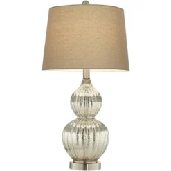 An elegant and fresh accent for your decor, this mercury glass table lamp set sit on a round base. The cool silver tones in the body are complemented by the warm color in the drum shade.