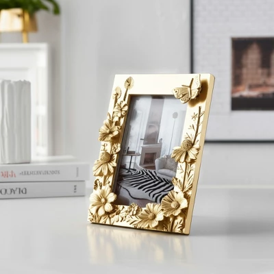 Enhance your home or office decor with this stunning gold metallic photo frame, designed to bring elegance and sophistication to any space. Crafted from high-quality polyresin and glass, this exquisite frame features intricate floral detailing and a charming butterfly accent, combining artistic craftsmanship with durability. Measuring 6x1x8 inches, it is the perfect size to showcase your most treasured memories on desks, shelves, or bedside tables. The sturdy glass front ensures your photos remain protected from dust and damage while maintaining crystal-clear visibility. The vintage-inspired gold finish complements a variety of interior styles, from modern minimalistic to classic traditional, effortlessly elevating your decor. Whether placed in the living room, bedroom, or office, this frame adds a touch of timeless charm and warmth to your space. Designed for both portrait and landscape orientations, it offers versatile styling options to suit your needs. This decorative frame is more than just a display piece; it is a meaningful way to preserve special moments and makes a thoughtful gift for birthdays, anniversaries, or housewarming occasions. Easy to maintain and built to last, this elegant frame is a must-have for anyone looking to add a refined touch to their decor. Elevate your space today with this beautifully designed gold photo frame and give your favorite memories the perfect display they deserve. Order now and transform your home or office with timeless elegance.
