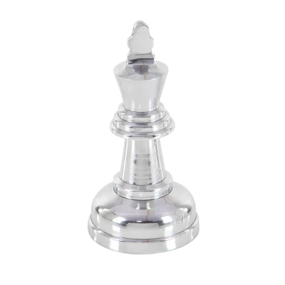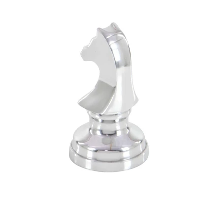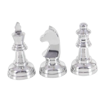 Accessorize your console table or living room dresser with this 3-in-1 set of large, decorative chess piece finials. The chess sculptures include the queen, king, and knight. All carry a chrome-like, metallic silver finish of a solid aluminum. Such a design makes for an unapologetically bold table décor while creating a sophisticated and stylish narrative inside an traditional-themed space. Use as a decorative piece and show your guests your competitive side!. The design makes for an unapologetically bold table décor while creating a sophisticated and stylish narrative inside an eclectic-themed space. Designed with black rubber stoppers at the base that prevent scratching furniture and table tops, as well as sliding around. Wipe clean with a dry cloth. Suitable for indoor use only. Made in India. This set includes three chess pieces. Traditional design. This item comes shipped in one carton.