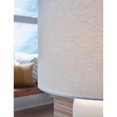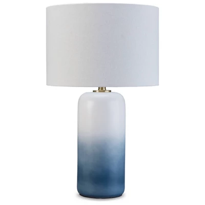 A dramatic ombré design defines this table lamp. Crafted of ceramic, it features broad, saturated bands of color that gradually fade to white toward the top. A natural fabric shade extends the tonal gradation and provides a tailored finishing touch. Table lamps are the perfect way to spice up your existing decor, all while providing warm ambient lighting to set the mood. Brighter, well-lit spaces always tend to look larger, smarter and so much more visually appealing. With a wide variety of shapes, sizes and styles at Ashley, we’d say your future is definitely looking bright. Signature Design by Ashley is a registered trademark of Ashley Furniture Industries, Inc..
