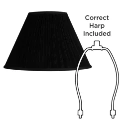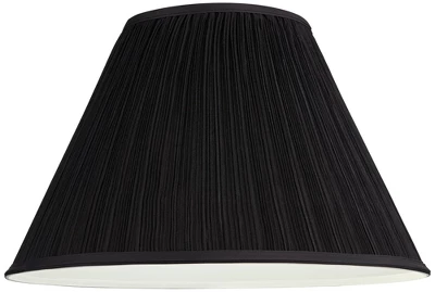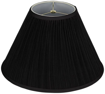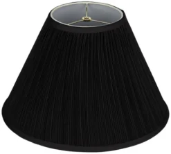Add drama to your decor and update a favorite lamp bases with this set of two black fabric mushroom pleat lamp shades. From the Springcrest Collection brand of lamp shades, the design has a fine pleat pattern called the mushroom pleated style. The black fabric shades have self trim top and bottom. They come with a brass finish spider fitting, and the correct size harp and a finial are included free with each shade.