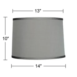 A sophisticated and urbane tapered drum shade featuring a cool platinum gray faux silk material. A darker ribbon material is used for the trim top and bottom. Use the shade to refresh an existing favorite lamp.