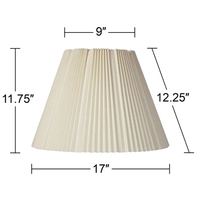 - Set of 2 lamp shades. Each is 9″ across the top x 17″ across the bottom x 12 1/4″ on the slant x 11 3/4″ high.