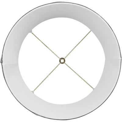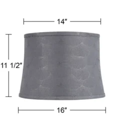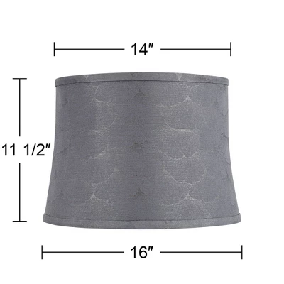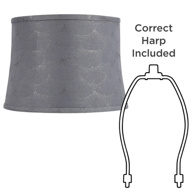 Modernize a favorite table lamp with the chic pattern and gray hues of a contemporary softback curved drum lamp shade. It showcases a slight hourglass profile, with subtle abstract repeating pattern that calls to mind a fan-shaped leaf. Self trim adds a tailored final touch to a lamp shade that arrives with a harp and finial.
